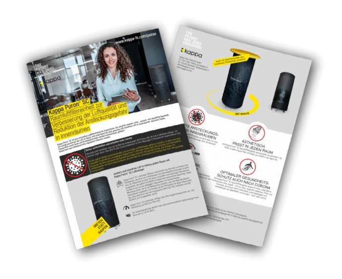 Der Kappa Puron® SC ist ein Raumluftfilter zur Verbesserung der Luftqualität und Reduktion der Ansteckungsgefahr. Das Filtersystem scheidet Viren, Aerosole, Feinstaub, Pollen und Keime aus der Luft hochwirksam und permanent ab. Das sorgt für eine gesunde und viren- sowie schadstofffreie Raumluft.